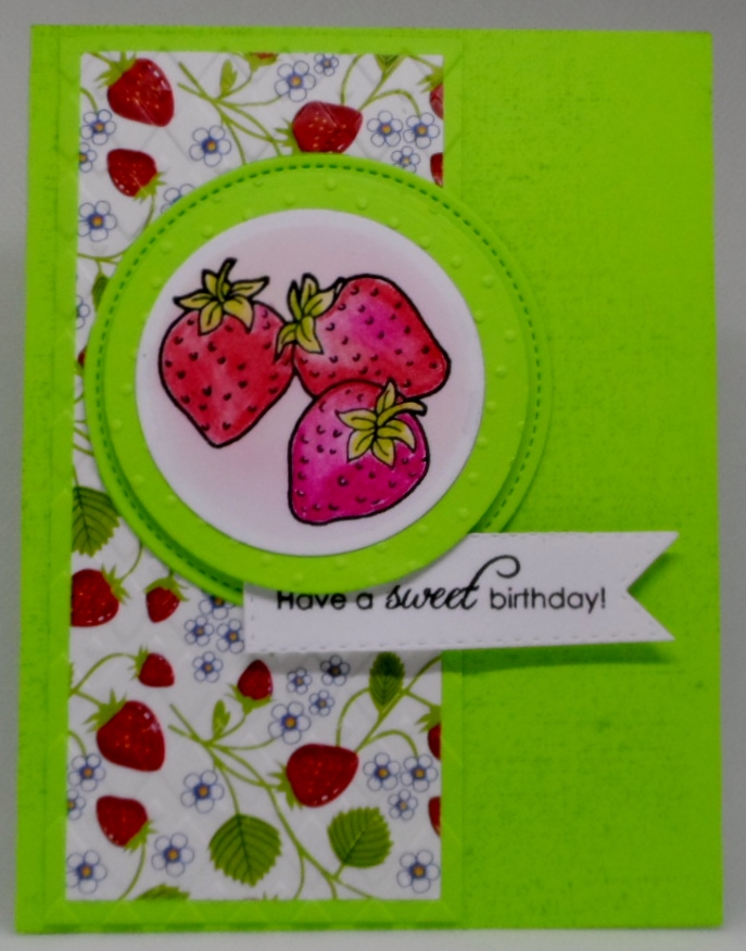 Your strawberries look so yummy, and I love the green layered circles with the texture and dots. Love that paper, too.