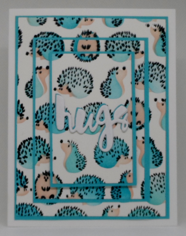 Aquamarine is the birthstone for March my birth month and has always been a favorite color of mine. My goal is to ink up some sets that have been sitting in bins unused way to long and first up is: Taylored Expressions HedgeHugs Stamp and Layering stencil set. The background stamp was inked in black ink and then the layering stencils for the bodies in two shades of aqua with light handed TE’s Peaches n Cream for the belly and face. This was a cute gift with purchase set from TE in February. Using Waffle Flower A2 layering dies to cut and mat a few panels and a SimonSaysStamps word die for the sentiment will complete my card today.