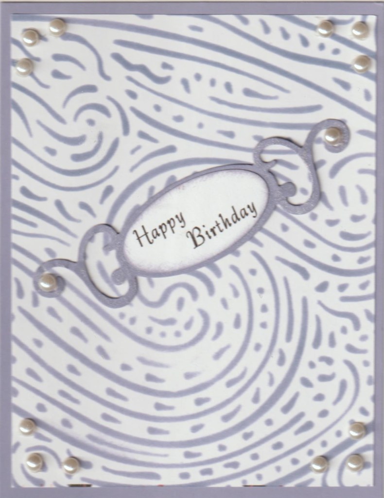 Stencil used is by Hero Arts, die cut tag is Spellbinders. For just a little sparkle I added Wink of Stella to the label. Sentiment was printed on the computer and punched with a Stampin Up punch and lightly sponged the edges with Whisteria Wonder. Pearls were in my stash.