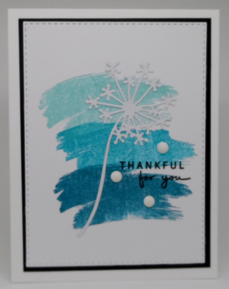 For my card, I used two stamps from Gina K Designs’s All Occasion Flowers stamp set from the Pocketful of Sunshine card kit inking the stamps in first Sea Glass, the second stamp in Blue Lagoon and repeating the first stamp in Tranquil Teal. Stamped the sentiment in black onyx ink. Then to the Big Shot to die cut my whispy greenery, and the focal panel using AI’s Rectangle A2 Double Stitched die, layered on black cardstock and trimmed it down, then added it to a white card base. Final touch was Taylored Expressions Matte Enamel Dots.