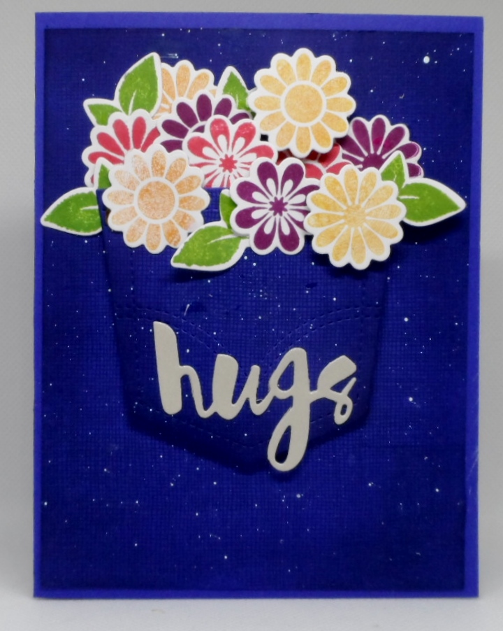 My card today was inspired by the book The Sisterhood of the Traveling Pants which is a best friends story and a pair of jeans shared by these friends. So using the pocket die from a recent Gina K Designs die, I created “jeans” using blue cardstock, stamping gauze background stamp in navy ink and ink blended the edges. Stamped and die cut a number of flowers from the GKD All Occasion Flowers set and added a SimonSaysStamp hugs die to complete my card.
