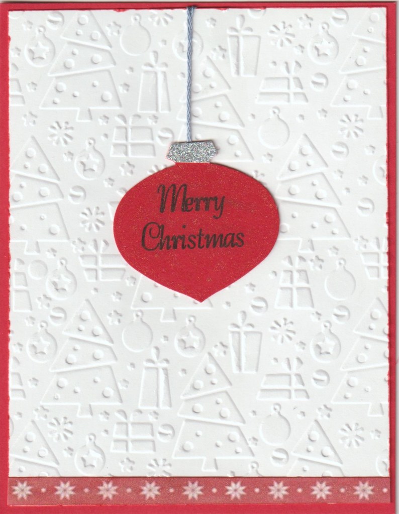 Recently I bought this no name embossing folder on Amazon and thought I better use it. I’ve had this ornament punch from Stampin Up forever. After printing the sentiment and punching it out I punched just the top from glitter paper to add. String is just scrapbook thread. It doesn’t show much in the photo but I added Wink of Stella to the ball to get e little shine. Bottom border is computer clip art that also has Wink of Stella on it. I can’t decide if I like it or not.