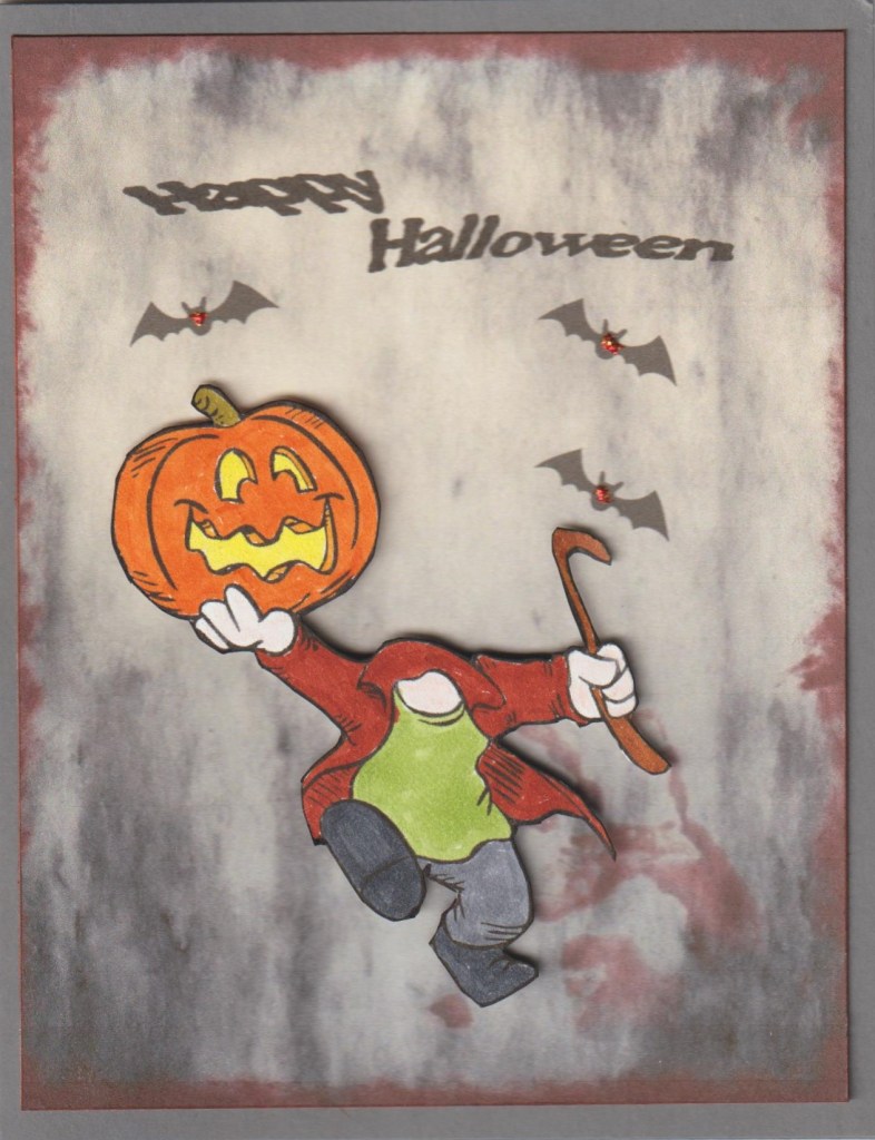 Hello and welcome. I just couldn’t resist using this online coloring page image again. Background paper was found online. Sentiment was printed in my Hallmark card program, bats are Hallmark clip art. I kind of messed up the bat’s eyes by using a toothpick to add a little red Stickles. Image was colored with Copic’s and popped up. I actually think this is kind of cool.