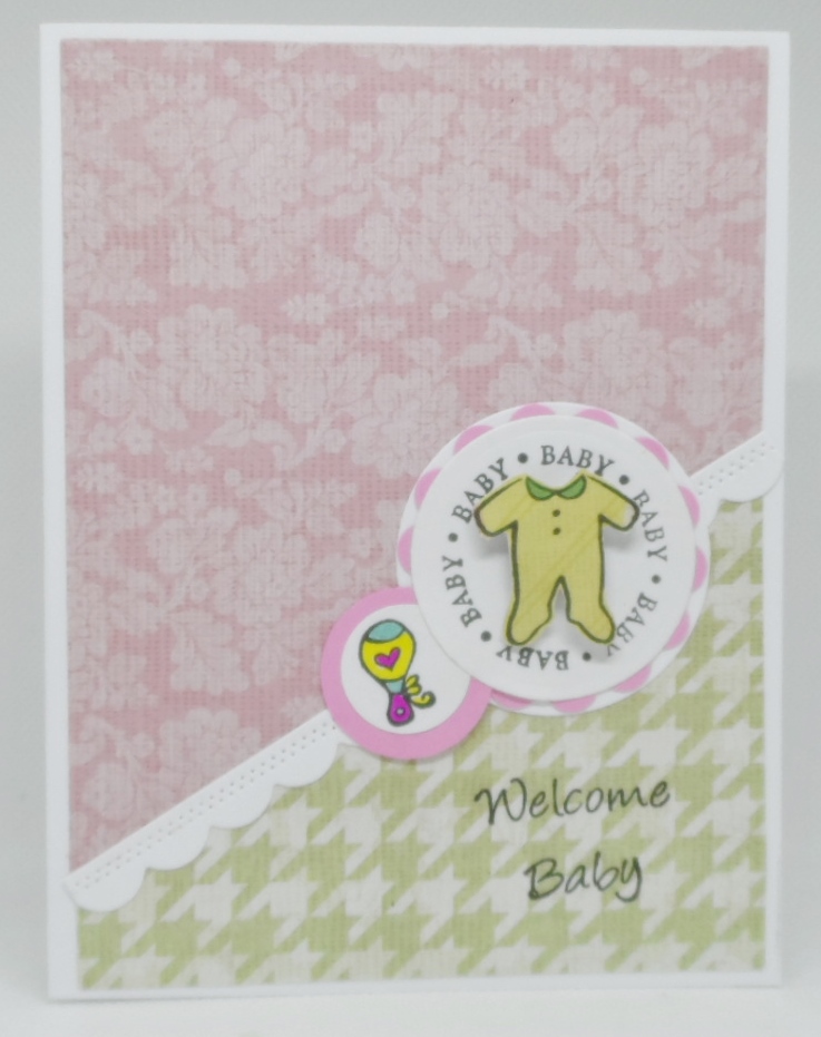 A new grandbaby is one the way for a dear friend so I made this card for the little one. Sage green is a favorite color of mom-to-be and found these two patterns in a The Paper Studio Sweet Pea paper pad that was in my stash, Denami Stamps onesie and rattle as well as a sentiment from a Inkadinkadoo stamp that needed some stamp surgery. The split background was made with Taylored Expressions All Planned Out 1 dies and circle punches from my stash.