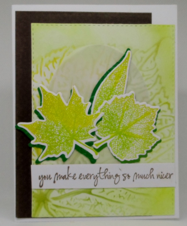 Pretty! Your leaves and stenciled background look great, and I love the shades of green you used.