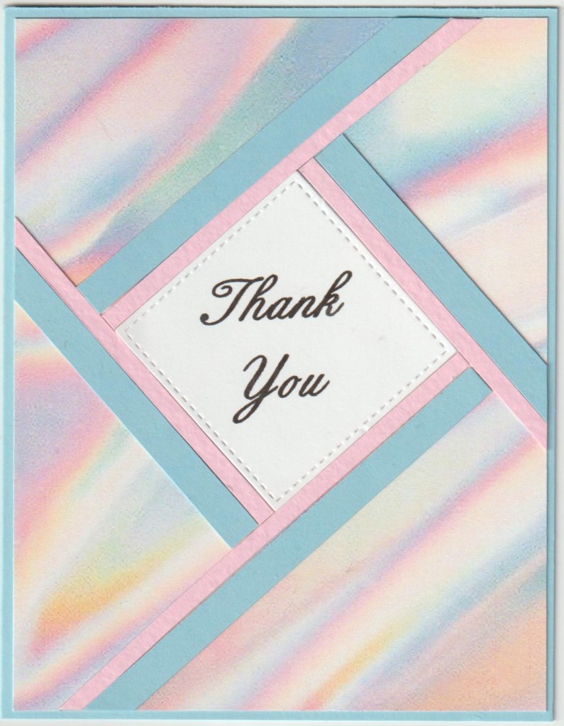 Background paper is from my online stash, die cut is Stitched Squares by Die-namics, sentiment was printed on the computer. The pink strips were cut 1/8″ wide and blue strips are 1/4″.