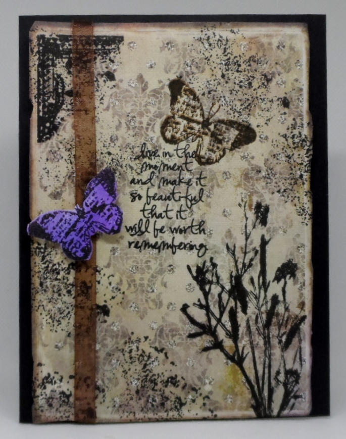 Stepping out of my comfort zone with this card and a Vintage and/or Shabby Chic challlenge at the As You Can See It Challenge Blog. The background patterned paper was included in a goodie bag from Unity Stamps on a recent purchase. I added a variety of stamps from Tim Holtz Visual Artistry Collection Stampers Anonymous stamp set Nature’s Elements. I added a brown ribbon for good measure and just needed a pop of color with my purple butterfly. I really liked the sentiment and know just which one of my friends I can send this card to.