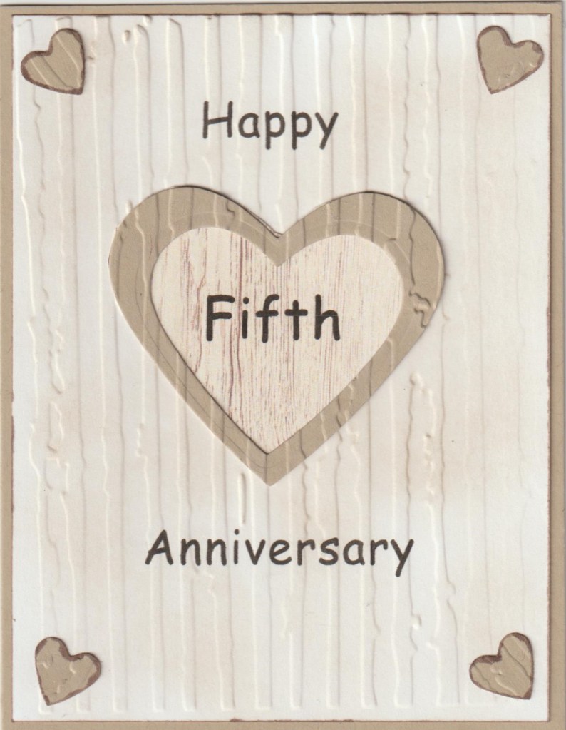 Hello and welcome. This card is for our granddaughter & hubby. Thanks to Google, I found out wood is traditional for the fifth anniversary. Panel was run through a Cuttlebug Wood Grain ef then lightly sponged with Crumb Cake stamp pad. Center heart frame is Stampin Up’s Sweet & Sassy Framelits also run through the Cuttlebug ef. Corner hearts are a small heart punch also dry embossed. It doesn’t show in the photo, but the center of the large heart is wood grain pp found online. Sentiment was printed on the computer.