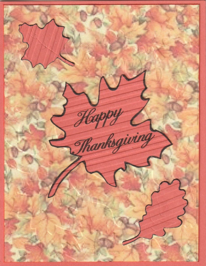Pattern paper was found online. The pp was embossed with a Cuttlebug Leaves ef but it doesn’t really show so I also embossed the leaves. Embossing folder used for the leaves is a no name one from Amazon. Leaf with sentiment was printed on the computer then fussy cut. Small leaves dies are also no name from Amazon.