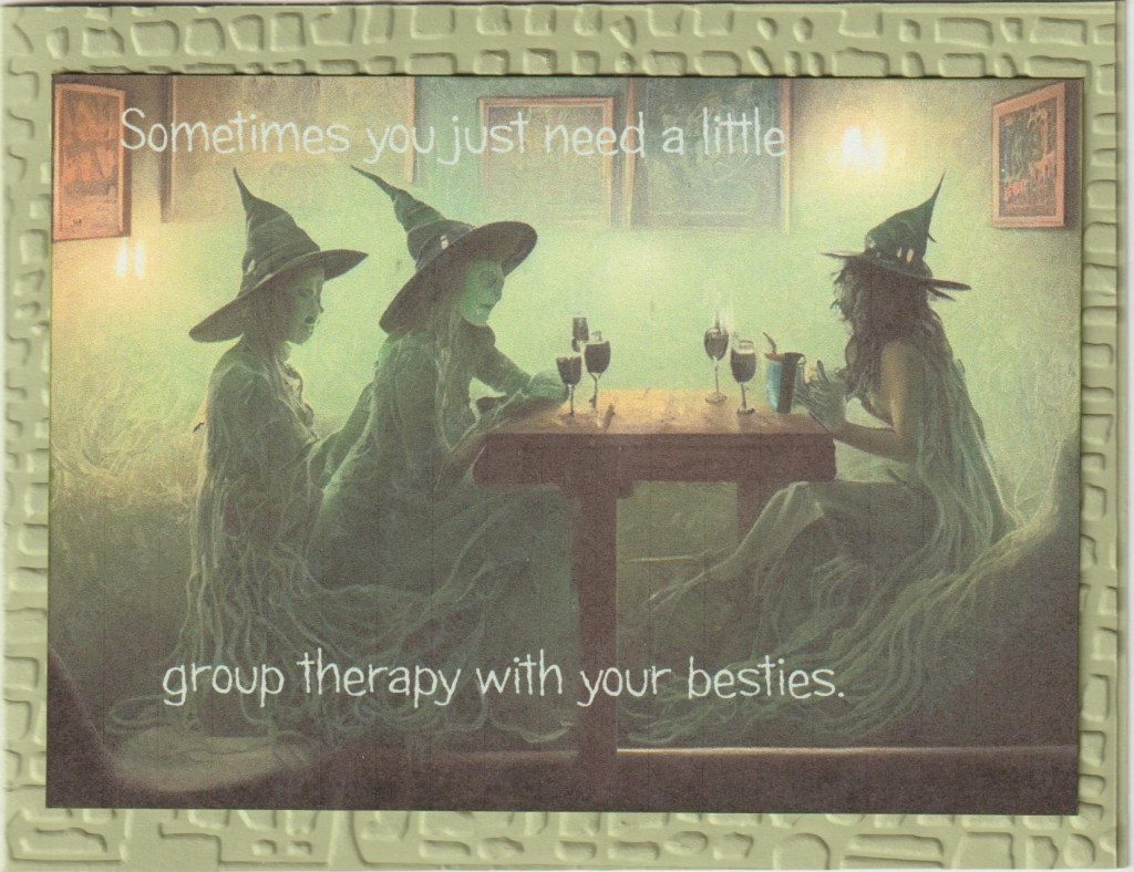 Hello and welcome. When I saw this quote, “Sometimes you just need a little group therapy with your besties.” I knew I had to use it somehow. I Googled witches drinking wine clip art and found this photo. After sizing it in my Hallmark card program I printed the quote. The top line doesn’t show well in the photo, but it does show quite well in real life. For a little more interest, I embossed the top card base with a Sizzix ef. Sorry I don’t know the name of it. I wasn’t too sure about it till hubby saw it and liked it.