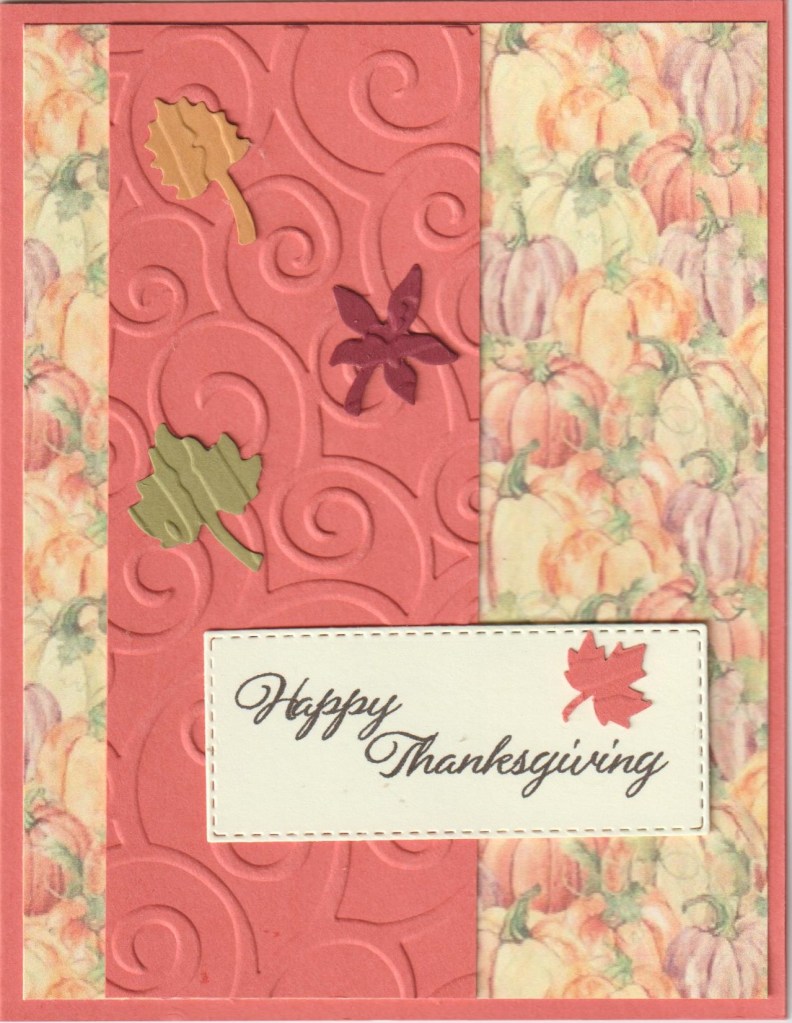 Hello and welcome. While thinking about making a Thanksgiving card I came across this piece of pp and thought that would be perfect. Strip and leaves were embossed with Cuttlebug embossing folders. Sentiment was printed on the computer and cut with Stitched Rectangles by Die-namics. The punched leaves were in my fall stash.