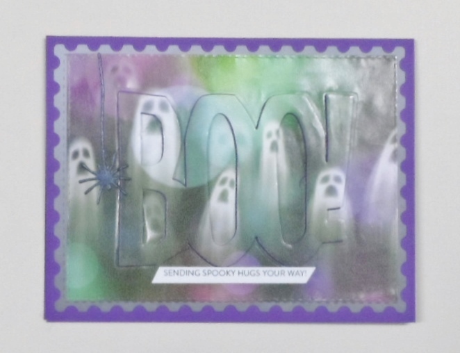 Whimsy Stamps patterned paper combined with a Tim Holtz Big Frights Boo! die and spider, layered on a purple card base with a Taylored Expressions postage stamp panel in grey for this card. The Boo! layered to create an eclipse effect for my background.