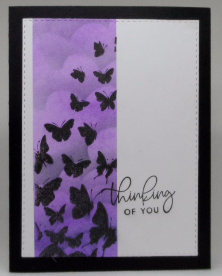 Using masking paper to create a side panel that was then ink blended in purple, I then added some clouds with a stencil and black onyx ink and Taylored Expressions Aflutter butterflies and sentiment to complete my clean and simple card design.