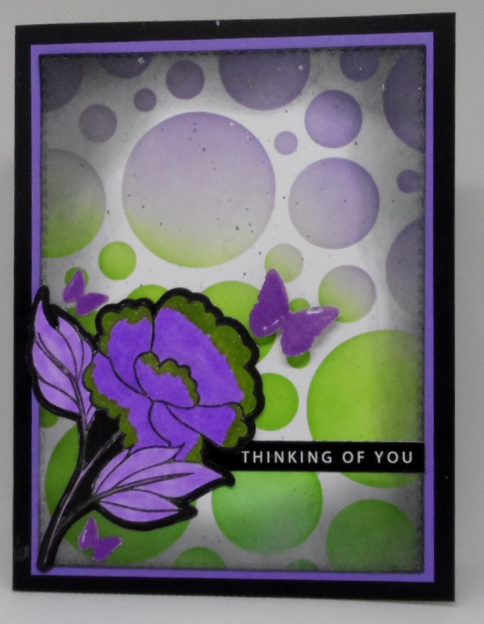 I was trying very hard to NOT make a Halloween card but somehow I don’t think I achieve that target!!! The Cardz 4 Galz challenge is to pick at least 3 of these colors — Purple, Orange, Black or Green. I chose purple, green and black…..no orange. My Gina K Designs Forever Flowers stamp and die was colored with a Bic Polnyesian Purple marker and tipped with a green Ohuhu marker. After die cutting, I filled in the white outline with black marker. Next up was my background which uses SimonSaysStamp Mix and Match Circles stencil in GKD Lovely Lavender ink and a combination of Taylored Expressions green inks, the outside edge was sponged with Tim Holtz Distress Black Soot. A little splatter in black and purple, a sentiment strip in black and Martha Stewart trio butterfly punch. Still looks like Halloween to me….???