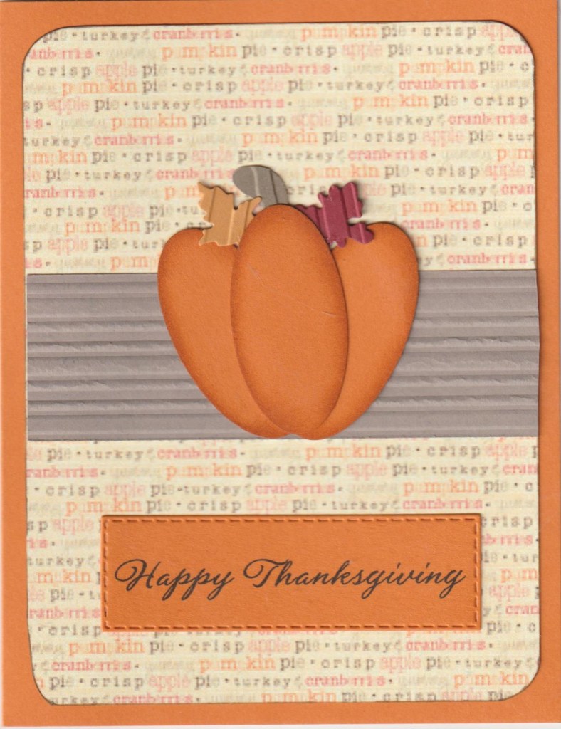 Hello and welcome. Today’s card came about because I wanted to try making a punch art pumpkin. Background paper was in my stash. I used Stampin Up’s small oval punch for the pumpkin, small leaves had been die cut a while ago, stem was fussy cut. Center strip was run through an embossing folder by The Paper Studio. Sentiment was printed on the computer and cut with Stitched Rectangles Framelits from Stampin Up. Corners of pp were rounded, and ovals edges were sponged before putting together.