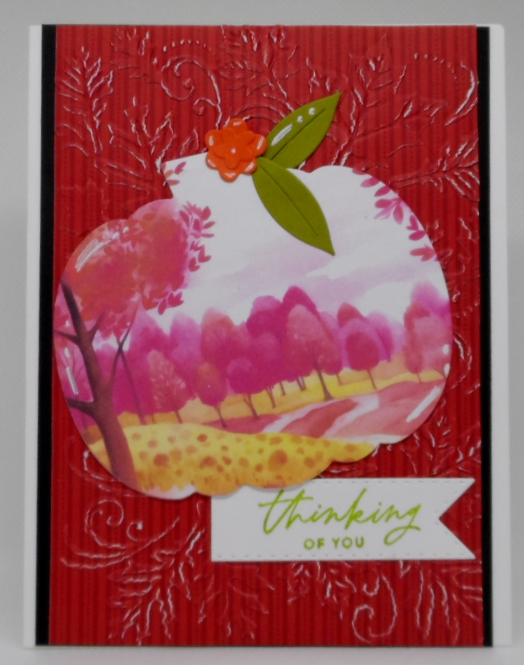 A little different look for me and it’s just OK. The designer card I CASEd from Whimsy Stamps looked so much better. I am loving Whimsy Stamps and their designer paper packs. Using a Recollections pumpkin die, I die cut my scene from the Pink Autumn paper pad, patterned paper from my stash that was embossed with a leaf background embossing folder and sentiment from a SSS stamp set with the addition of a few die cut leaves and flower to top off the pumpkin. It’s ok and maybe better than horrible to use Gina K’s words.