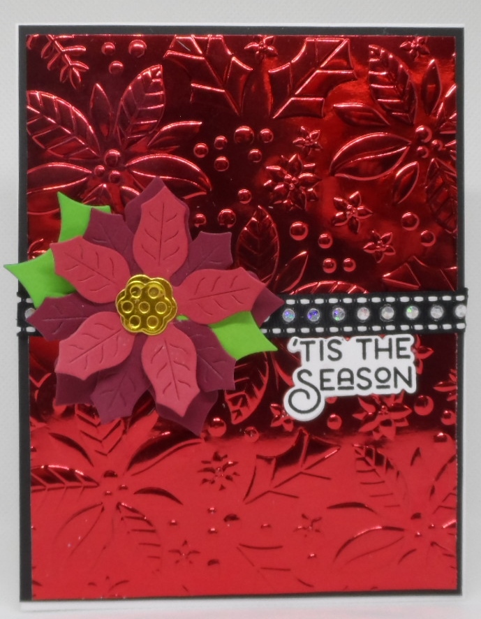 A Taylored Expressions Poinsettia and Pines embossing folder on a piece of glossy foil red cardstock layered on piece of black cardstock creates the focal background of my card today. A piece of black ribbon with some baubles, a TE sentiment and Sizzix poinsettia die completes my card.