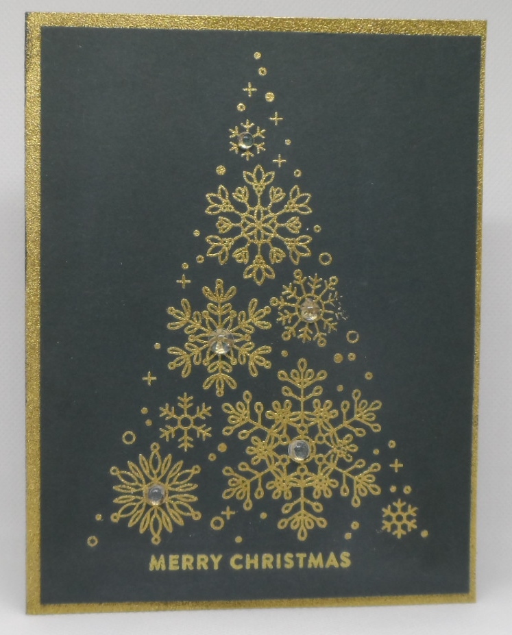 A gold embossed snowflake tree layered on dark green SSS cardstock and sentiment. The snowflake tree is a SSS Glistening Snowflakes stamp set and sentiment from their Joyful Season set. The notecard edges were gold embossed also for a bit of a border. Hard to see but there are 5 clear baubles on my tree for decoration. This color reminds me of the car color I wanted when we purchased our first car after getting married……I ended up with a blue car, then a black car or two and now an octane red car but no green one….so this card is for Will (hubby). Wonder if he will follow my train of thought?!?!? LOL!! This is a good color for me!