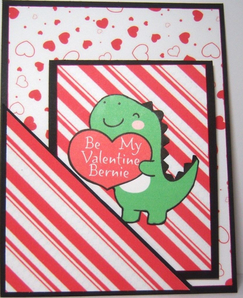 Hello and welcome. Since my first pocket card turned out so well, I decided to make more. This one will go to our 3-year-old great-granddaughter. She loves dinosaurs. Both patterned papers were found online, and the dinosaur is computer clip art. After printing ‘Be My Valentine Bernie’ I fussy cut Dino. I still have a 7 & 5 year old great-grandson’s that will also get pocket cards. Hopefully they’ll like that there’s an easel back.