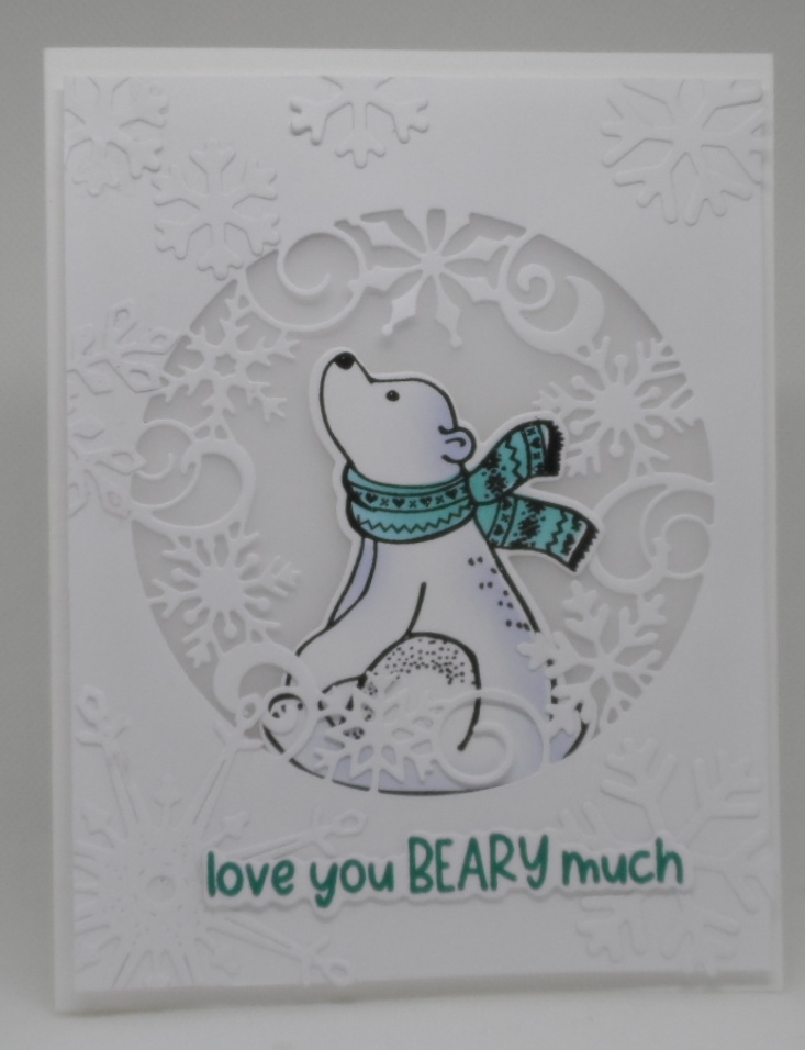 Great white on white card design! I love the touch color you added to the scarf; it really does help bring the focus to the bear while still keeping the white on white look.