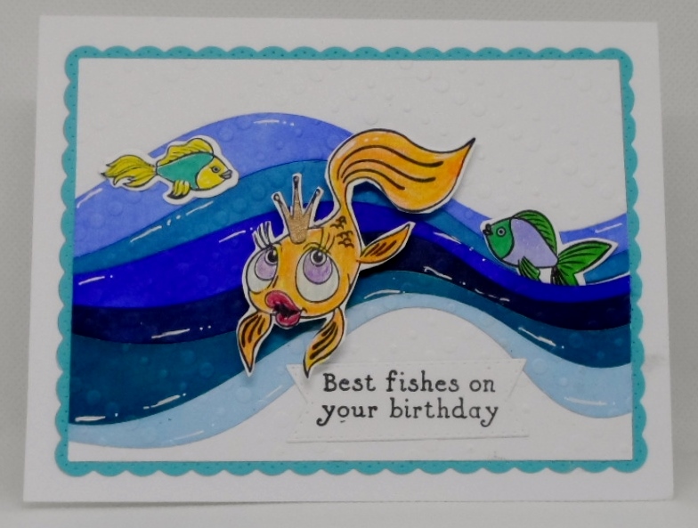 Playing along with a “F” theme alphabet challenge today with a FISH card. Pulling out an old Gina K Designs Quite A Catch stamp set for my queen fish and Hero Arts Fishy Stamp & Cut for two accompanying fishes and sentiment for meet the challenge. Taylored Expressions Rainbow Bright 3 die which was colored with some Spectrum Noir markers and the required embossing folder is also TE’s Rockin Rhombus. The EB folder reminded me of bubbles. I did clean my my “elf” space and used all the layers and notecard from my “mess”.