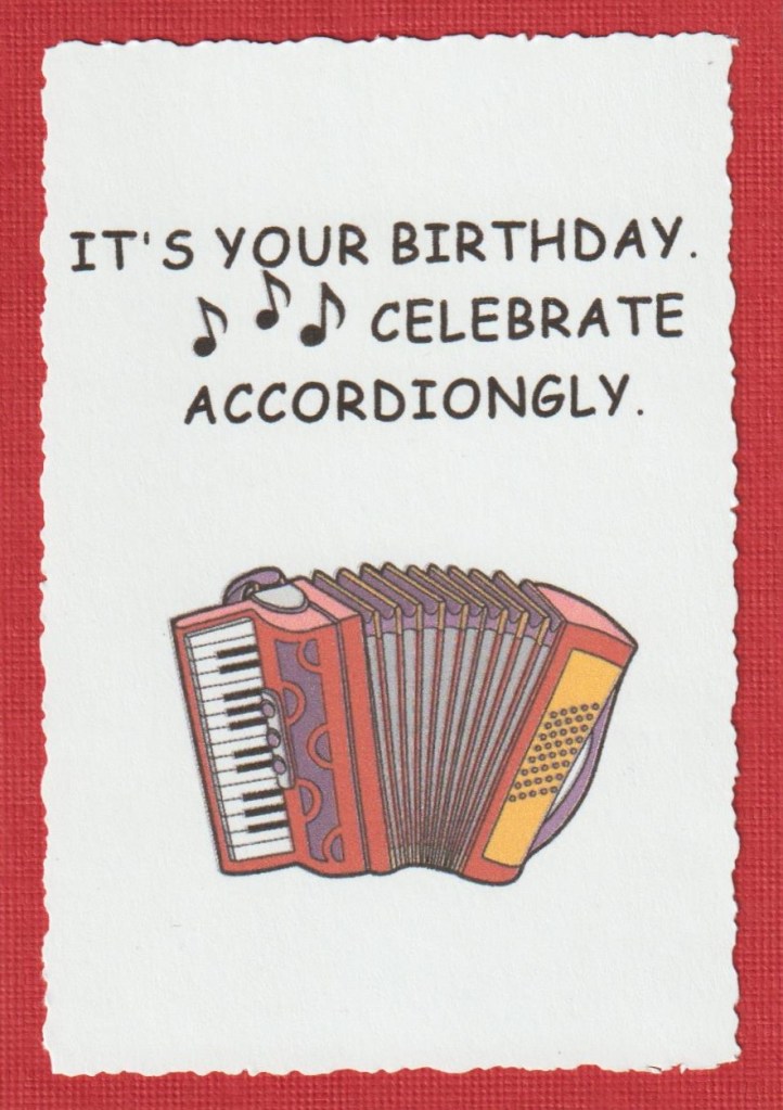 Hello and welcome. Hubby and I share the same birthday, and we stopped giving each other gifts or cards a long time ago. However, since he played the accordion in elementary school, when I saw a card like this on Pinterest, I just had to make him one. This is an easel card so I’m going to stand it on his desk. Image is clip art, sentiment and music notes were printed on the computer. Edges of top layer were cut with an antique photo cutter.