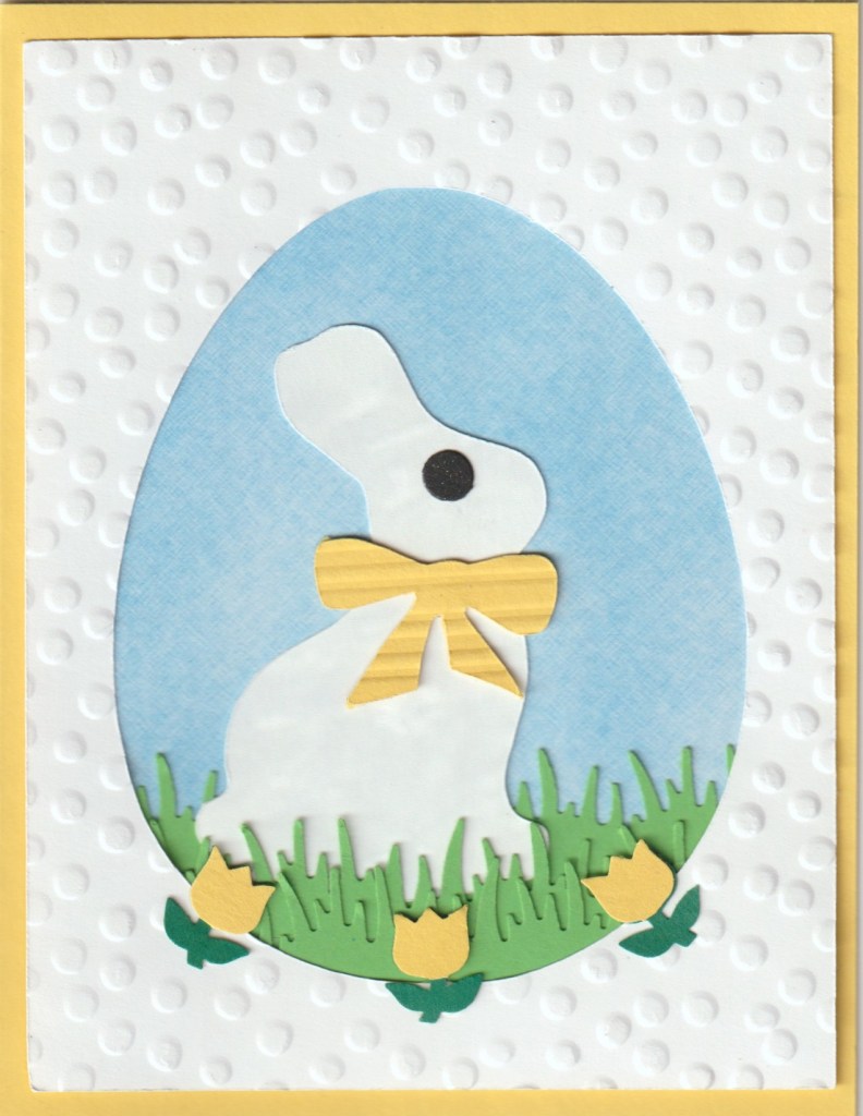 Hello and welcome. Finally, I got started on Easter cards for this year. The front panel, bunny & bow were cut on the Silhouette. Blue background is a small piece of paper from my stash. Grass is a Martha Stewert punch, tulips are from a very old small punch, eye is just a small hand punched circle. Panel is embossed with Stampin Up’s dots ef. For a little interest I ran the bow through the Paper Studio’s striped ef. The paper the bunny was cut from is white with kind of swirls throughout so it doesn’t look as start as white cs does. I was quite surprised to find that in my stash.