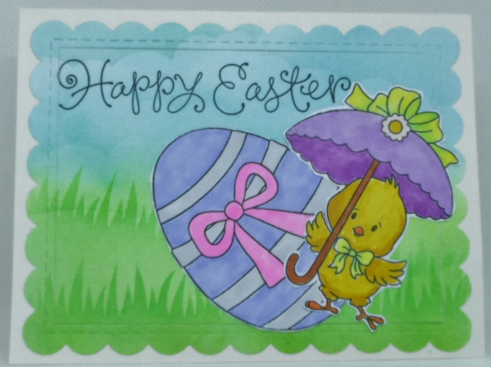 Time to get motivated with Easter cards and I thought I would begin with this cute stamp set from Simon Says Stamp “Hello Easter”. I know I used the umbrella chick before because I have a mask of the image attached to my stamp folder! But, trust me, this is a new card design. After stamping, coloring and fussy cutting the chick and the egg, I ink blended my background and then added a grass and cloud stencil. Sentiment is from same stamp set.