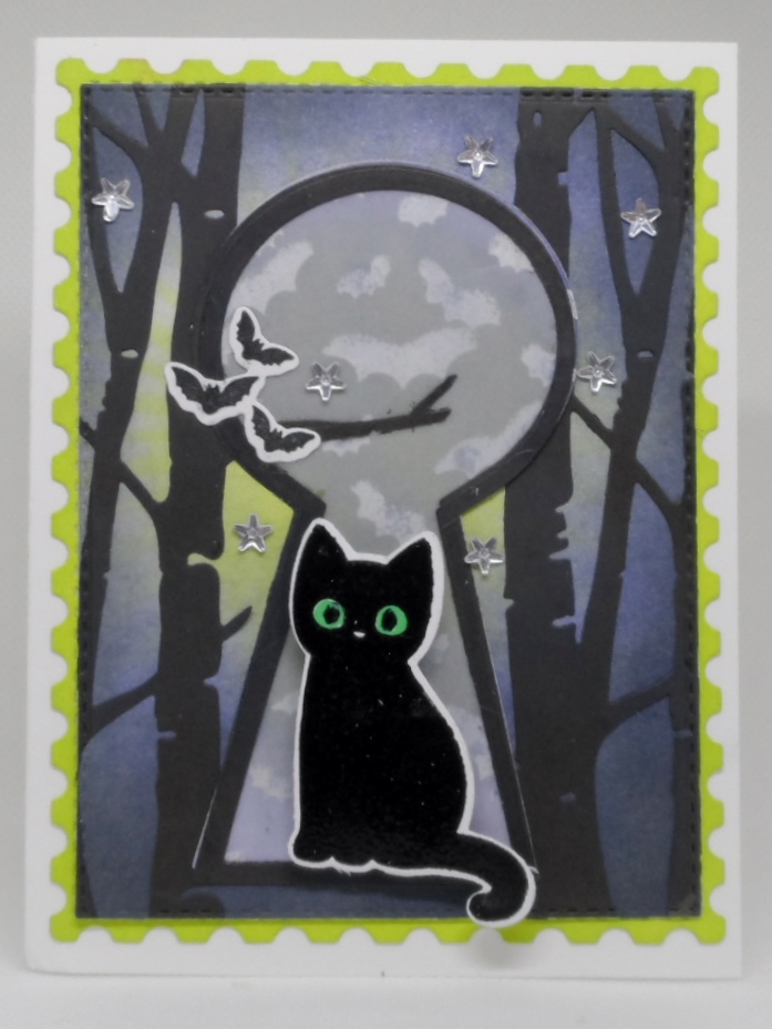 I had a plan!!! Thankfully I also had plan B whick was implemented to complete this card to my liking. I took my inspiration from this month’s mood board with the Two Old Bats Challenge. I pulled out a variety of product including Gina K Designs Haunts & Harvest stamp set, Whimsy Stamps Keyhold & Keys dies, AI Double Stitch Rectangle dies, Taylored Expressions Postage Stamp dies and Birch Tree Border die, Hero Arts Bats background stamp, Distress Oxide inks in Twisted Citron, Chipped Sapphire, Weathered Wood and Black Onyx. The bat background that was stamped in versamark and heat embossed in clear embossing powder then ink blended with the DO inks did not quite do it for me but used it as the keyhole with a piece of vellum on top of it. I inked a new background, die cut the birch trees, key hole, a few bats and my black cat. I added some color to the cat’s eyes and a few stars for the background.