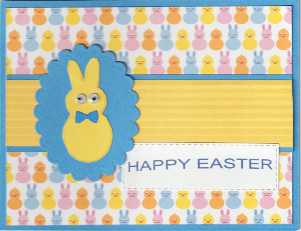 Today’s card is for our 7-year-old great-grandson. Patterned paper was found online, bunny peeps and bow tie are computer clip art that I fussy cut. I just had to go with googly eyes. Embossing folder used for the yellow strip from the Paper Studio, oval is Spellbinders scalloped oval. Sentiment was printed on the computer.
