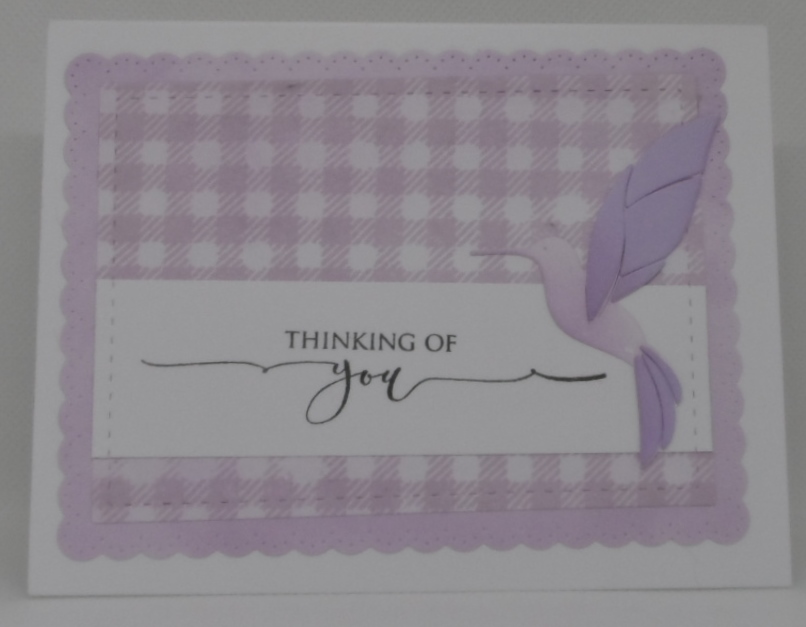 For a color challenge of pastels, I decided to use Gina K Designs Lovely Lavender inks. I stamped the focal panel with SimonSaysStamp’s Gingham background stamp, inked in the Lovely Lavender, ink blended a panel in the lovely lavender and die cut, added Gina K Designs Scripty Sayings 2 sentiment and Taylored Expressions Fit & Flutter Hummingbird die to complete today’s card.