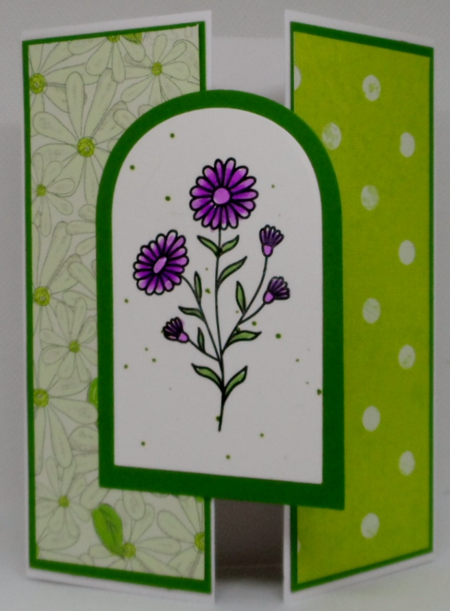 My gatefold card design uses a double-sided sheet of Creative Imaginations Iron Orchid Designs patterned paper from my stash. The Taylored Epxressions Framed Flowers focal image was stamped, color and die cut with TE’s Arched Stacklets dies.