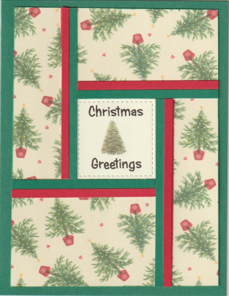 Hello and welcome. Getting a little jump on my Christmas cards this year. Background paper was found online, center die cut is Stitched Squares by Die-namics. Center Christmas tree is computer clip art, sentiment was printed in my Hallmark card program. For my fractured cards I usually cut the strips 1/4″ but since I wanted both red & green each strip is 1/8″.
