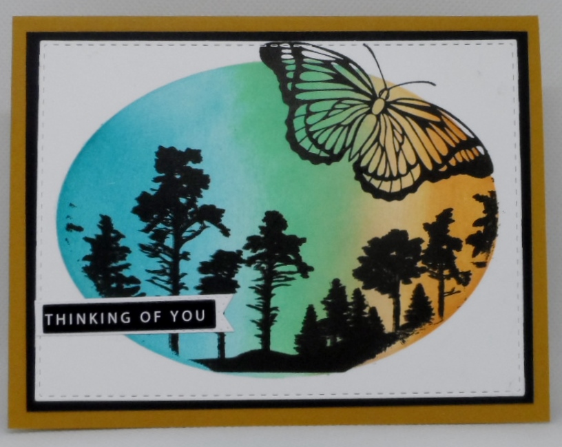 It was too difficult for me to decide on one color from Colorful Options May 2025 Challenge this month so decided to use the soft rainbow colors on my silhouette scene. The tree line and butterfly are part of Gina K Designs Friendly Silhouettes and a combination of SimonSaysStamp and Taylored Expressions inks. A TE oval masking stencil was used from my ink blending and to stamp my trees however that left side just wouldn’t completely stamp over the stencil so I found a sentiment strip from my stash to try to cover that section.