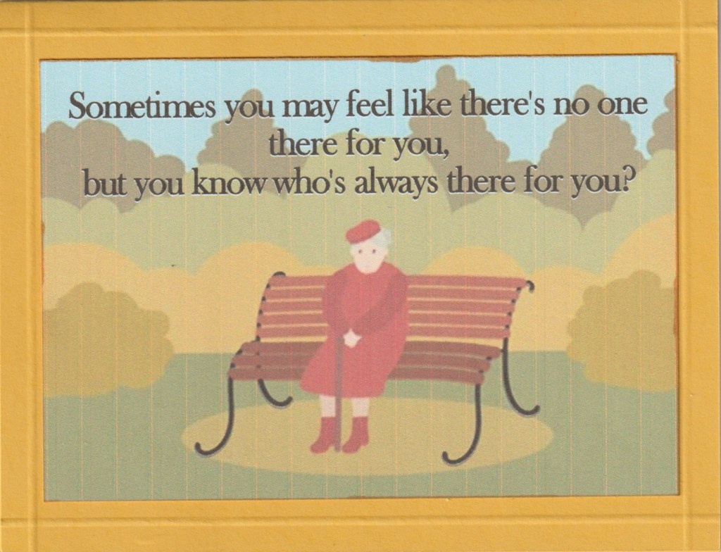 Hello and welcome. Oh yes, time again for DOS’s chuckle. Sentiment, “Sometimes you may feel like there’s no one there for you, but you know who’s always there for you? Laundry. Laundry will always be there for you.” was found online. For the image I Googled lonely old ladies clip art. To add a little interest, I scored all four edges. Very quick and simple. She loved it.