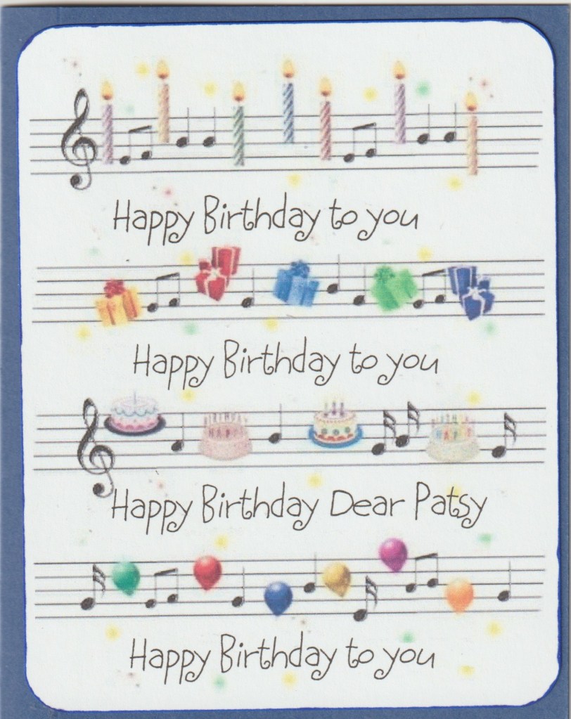 Hello and welcome. Today’s card is for my BFF since 3rd grade. Musical background paper was found online, and I add the words on the computer. I rounded the corners and used a marker on the edges of the pp. This was so quick and easy I really feel like I cheated big time. She liked it and that’s what counts.
