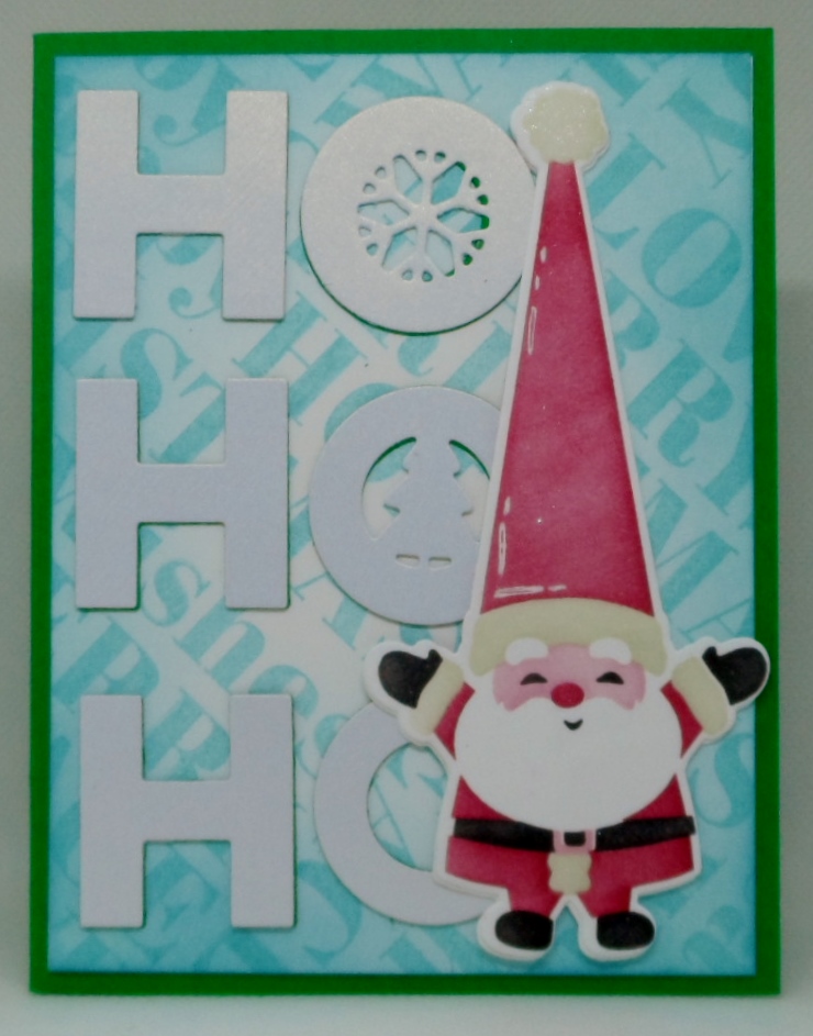 It’s beginning to look alot like……This is such a busy time for card making with Halloween, Fall/Thanksgiving and Christmas and my workspace has a bit of all three of these holidays mixed together on it. But today’s card will be all about Christmas. Taylored Expressions Ho Ho Holidays tall Santa is a layering stencil and die set, HO HO HO is a Spellbinders that I’ve had for quite awhile and it was time to use it. The background stamp is SimonSaysStamp’s Holiday Word stamp.