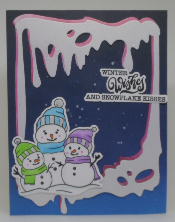 Tonight’s card is an adorable free incentive with purchase gift from Gina K Designs named Snowflake Kisses. A bit of color to the friends, a piece of patterned paper from my stash and Whimsy Stamps Drippy Frame die with a bit of spatter completes my card. My card will be shared with: