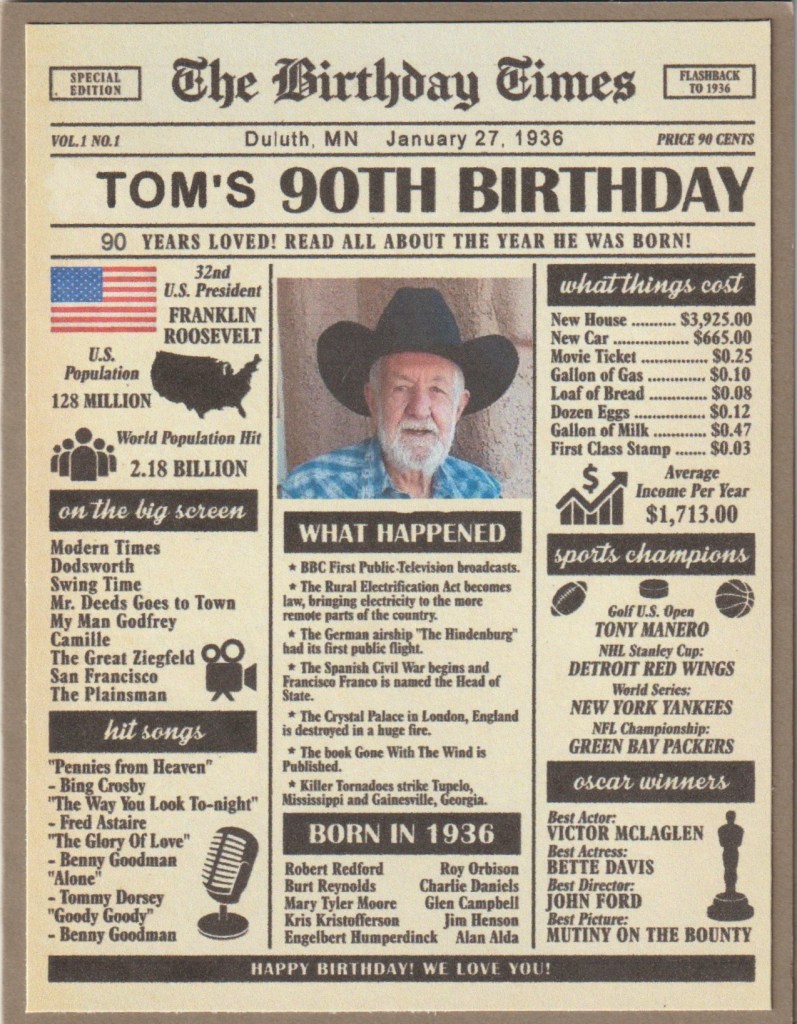 Hello and welcome. Today’s card is for my b-i-l. I found the headline page online and in my Hallmark card program I was able to add his photo and name. Inside sentiment “Happy 90th! You’ve officially reached vintage status.” was found online. I think he’ll especially like seeing what things cost back then.