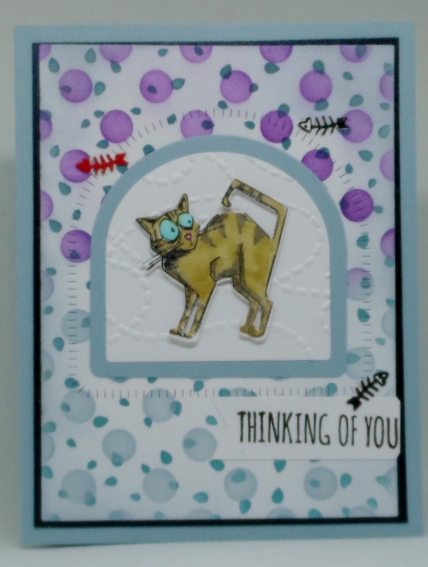 Playing along with the challenge at: Crazy is our Fame – STENCILS are our Game Stencil Fun January 2026 with an optional theme of Anything with Four Legs. I love the wonky cats from Tim Holtz Alterations/Sizzix stamp set. My background uses Taylored Expressions Wonky Dots stencil that I ink blended in two different colors of inks. TE’s Arch Noueveau dies were also used. My sentiment and the “fish” embellishments are also part of the TH stamp/die set.