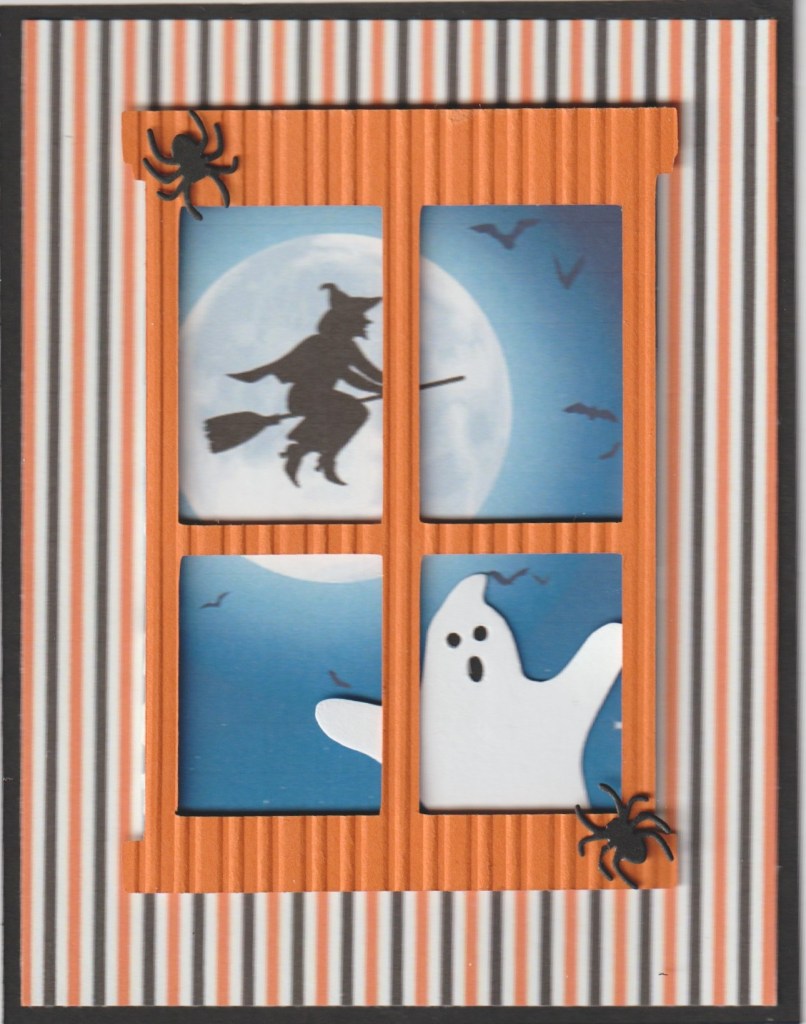 Hello and welcome. Like Buddy Gayle, I think it’s time to get going on Halloween cards for 2026. Patterned paper was found online, sky background with flying witch was also found online. Window frame is from the Silhouette and embossed with an ef from The Paper Studio, ghost is an old Sizzix die, spiders are from a die I bought on Amazon. The window frame is popped up with mounting tape. Popping the spiders up was a challenge since they’re so tiny but I managed to cut teeny tiny pieces of Stampin Up’s small dimensionals. Now that I look at it, I think I should have made the ghost a little smaller.