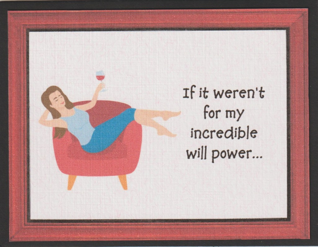 Hello and welcome. Dear old sisters first chuckle card for 2026. One day she had a notice from the post office that it would be delivered that day, but it never showed up. The next best thing is for her to see it here. Sentiment “If it weren’t for my incredible will power… I’d be exercising right now.” and image were found online. I even found this perfect frame online. This is not the ideal way for her to see it.