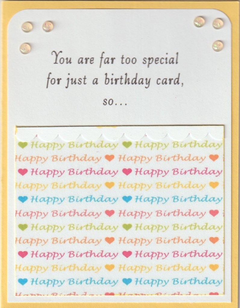 Hello and welcome. Today’s card is for a friend who appreciates my snark. Sentiment “You are far too special for just a birthday card, so…. please do keep the envelope too.” was found online and I have used it before. Looking through my old card photos, I found one I had made a few years ago with this design and decided to go with that layout again. Patterned paper was found online, scalloped border is a border punch, sentiment was printed on the computer, gems were in my stash and I used a corner rounder punch on the top corners.