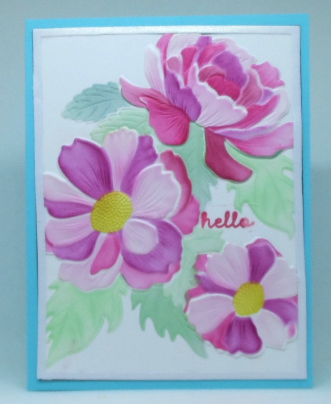 My card today was made using the following recipe: 1. One word (TE Framed Flowers Hello sentiment); 2. Die Cut (GKD Blossom Trio flowers were embossed, stenciled and die cut, 3. Frame white fraame from TE A2 Thin Frame Cutting Plate, 4. Flowers GKD Blossom Trio and 5. Shades of Pink GKD’s Light, Medium and Dark cranberry inks — pink to me…..LOL Always fun to play along with: