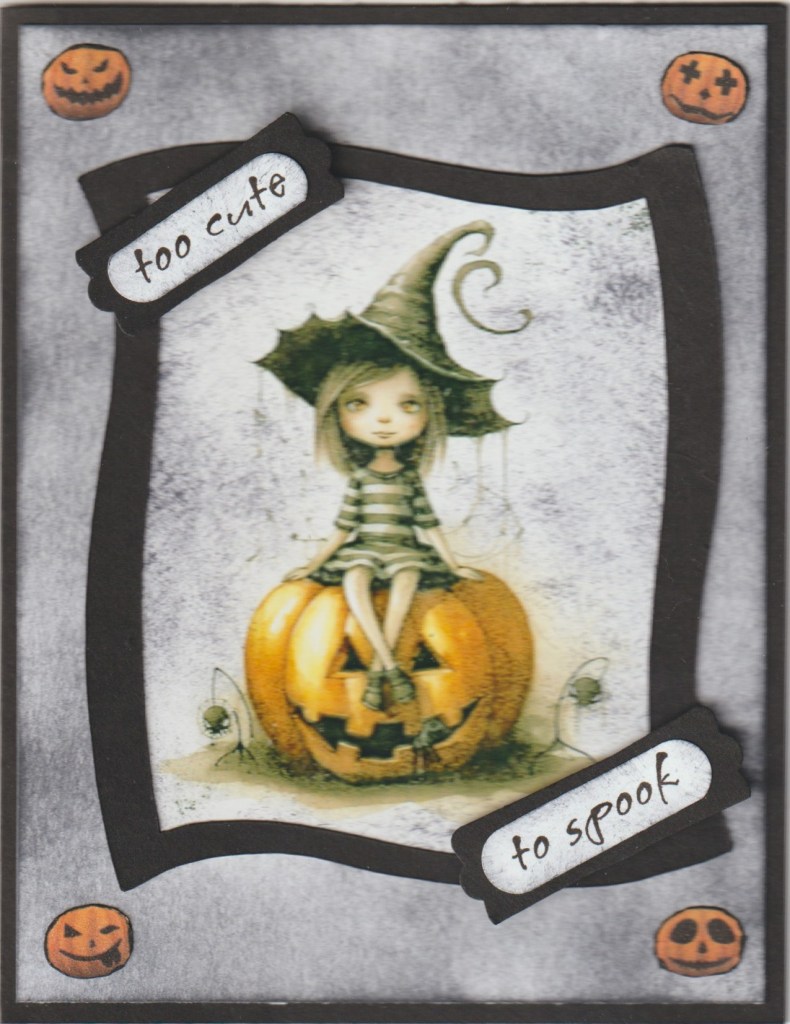Hello and welcome. This finished product is not what I started to make but I’m very happy with it. When I started, the image (which was gifted to me) was supposed to fit the full front of the card, well, that didn’t work because I accidently cut the image way too short. So, to selvage it I trimmed the sides down to make it a smaller rectangle. Using the Wonky Square in my Silhouette I stretched it a little to make it rectangle. Background paper is white cs that I smudged up with a cotton ball and black stamp pad, I also added a little smudge around that sweet little image. Sentiment was printed on the computer and punched with Stampin Up’s Word Window and Modern Label punches. As you can see, I also smudged up the words. Corner pumpkin heads are computer clip art, fussy cut with Wink of Stella added.