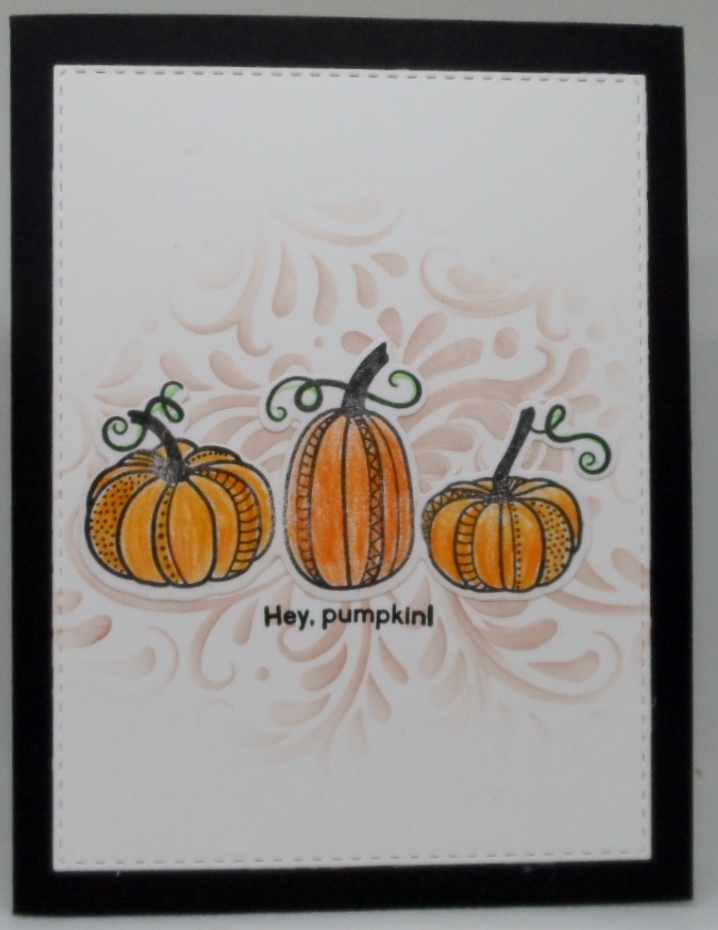 A CAS card today with a pumpkin theme which was achieved by using Gina K’s Harvest Flourish stencil and pumpkin trio from Haunts to Harvest stamp set. Sentiment was stamped from SSS Happy Haunting stamp set. A pretty simple card today but I kind of like the way it turned out.