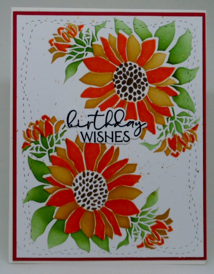 Taylored Expressions Create in Quads Sunflower Party layering stencil set along with a TE sentiment with some splatter were used to make my card today. I did color some of the flower petals with a marker as the inks used for the layering stencil was a bit to close to each other in the color family. The create in quads from TE are great way to build up my finished card stack!