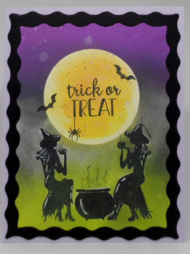 Taking time before the excitement and trick or treaters arrive the sister witches decided to have some “tea” and get ready for a busy night! For my card today, I decided on Great Impressions Witches Brew red rubber. After inking and stamping in black ink, I cut a mask of the witches, positioned the Tim Holtz layering moon mask in place and began my background ink by blending Distress Oxide Inks in wilted violet, black soot and twisted citron. I wish I would have kept the stamp in my misti to reink the image after completing the background. A bit of water splatter and some black soot. I added the detailed stencil of the moon and used yellow and orange inks that were on my dauber. Sentiment, bats and spider are SSS Spook up some fun stamp set and cut a frame using Taylored Expressions Squiggly Stacklets.
