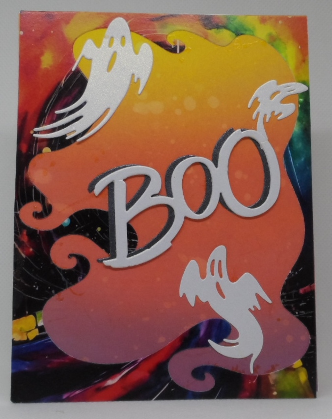 I’m still loving Whimsy Stamps and their Halloween products. This card Misfits card fronts and Chunky Checkers die set. I sponged white clouds with pigment ink on the black note card then covered it up with the focal image…..LoL. After adding paper spider web paper doily sections and three Tim Holtz spider dies and sentiment from the card front set, I can call this one complete and am loving it too.