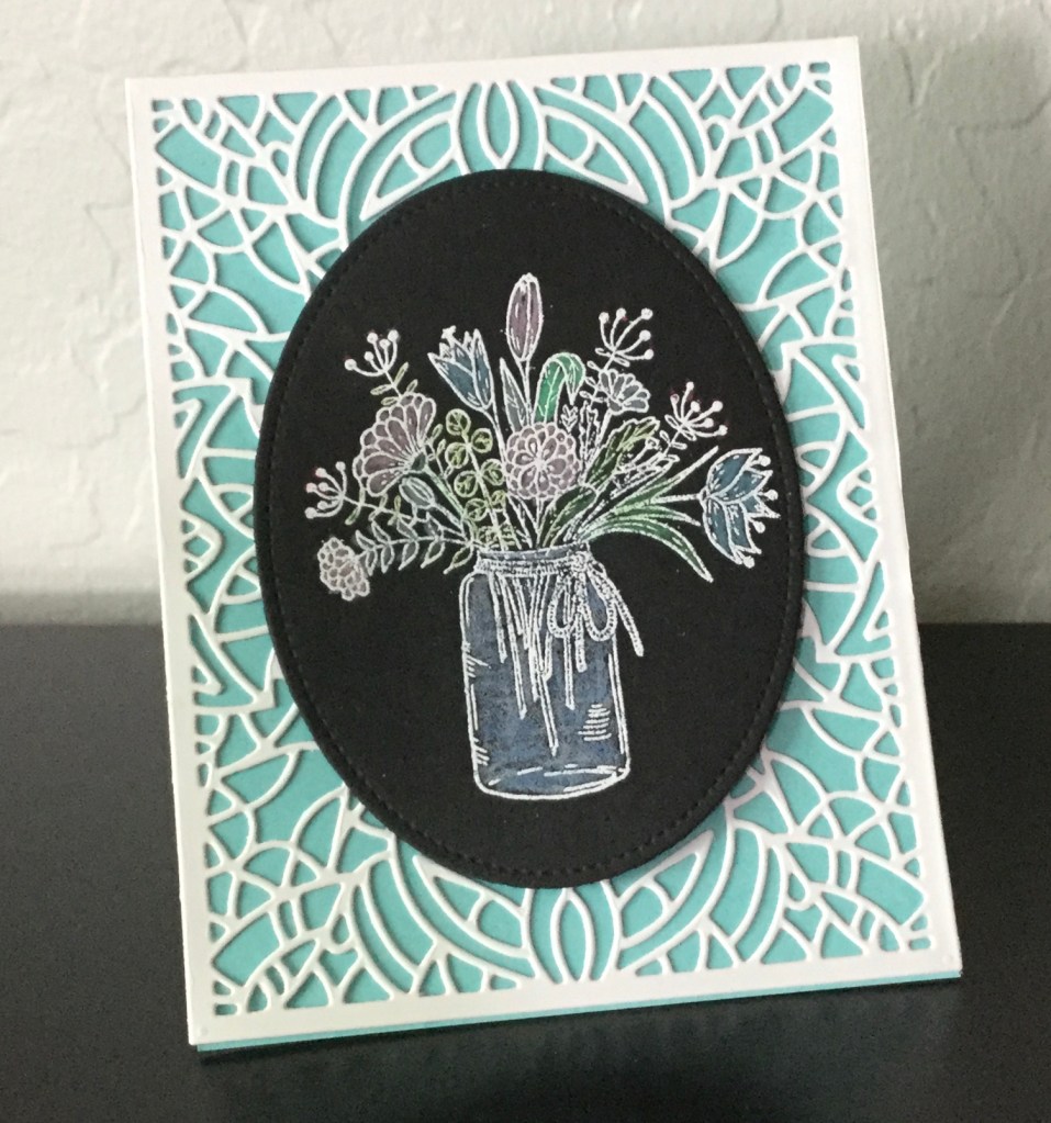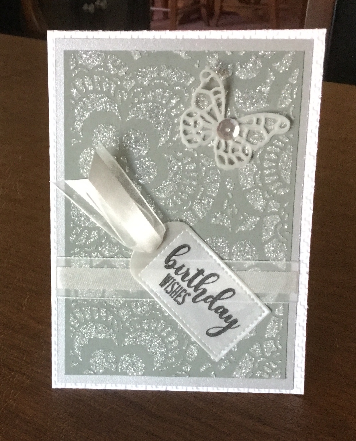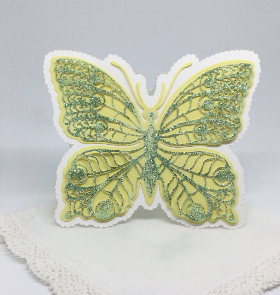The HC Butterfly die inspired me to make this card – I just purchased the die and love it! All paper and glitter are GK. White for the base card, and Sweet Corn the top later with glittered white on the top layer. Glitter is a mix of GK all mixed together – just had small amounts of several colors so mixed together. Could not get a good picture – is very sparkly and I am happy with it!